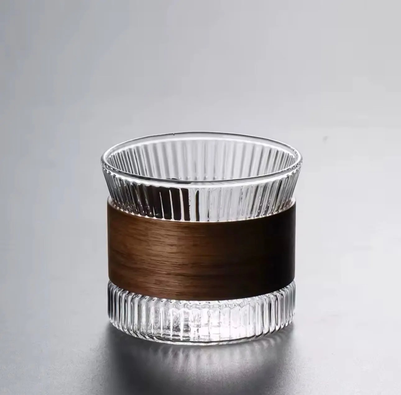 كوب قهوة زجاجي مع ايطار خشبي على الطراز الياباني